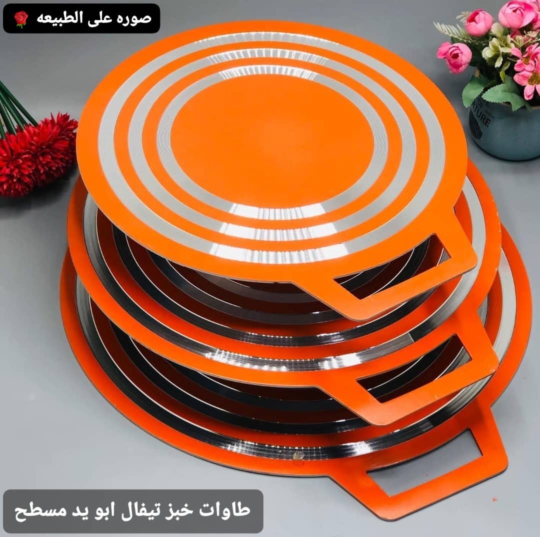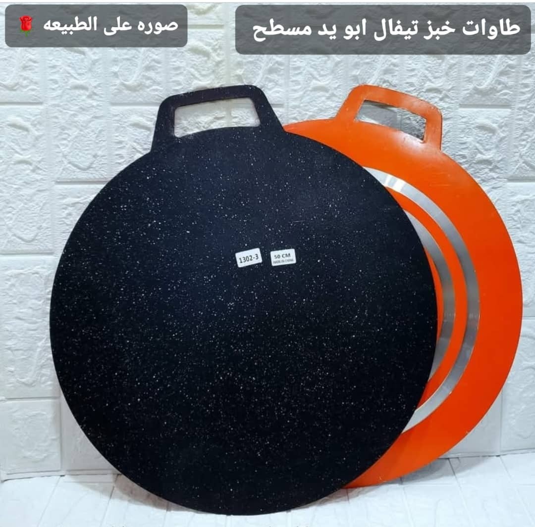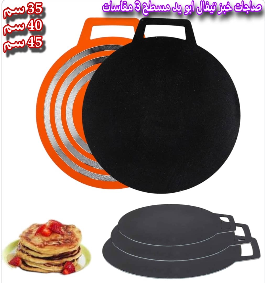 طاوات خبز مسطحة من الألمنيوم بسطح تيفال أسود ضد الخدش، آمنة وصحية 100%. قاعدة ألمنيوم موصلة للحرارة، سهلة الاستخدام والتنظيف، متوفرة بثلاث مقاسات.