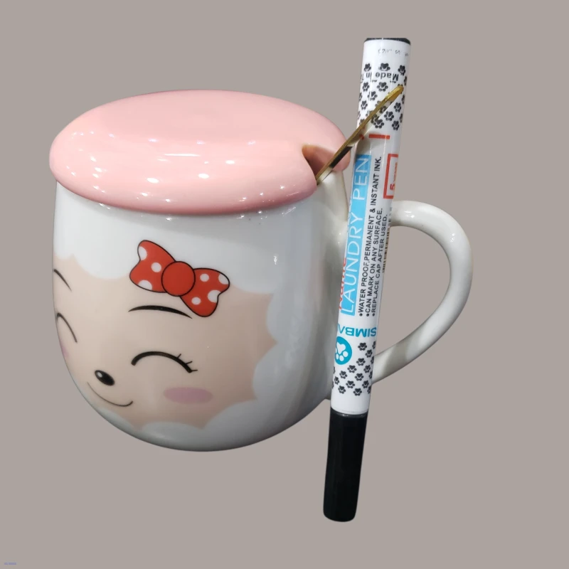 كوب سيراميك كرتوني أنيق يأتي مع غطاء مطابق وملعقة ذهبية صغيرة، مناسب للقهوة والشاي والمشروبات الساخنة. خيار مثالي للاستخدام اليومي أو كهدية مميزة.