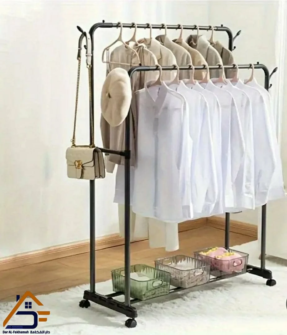 ستاند متين بقضيبين لتعليق الملابس اليومية، مناسب للغرف والمحلات.