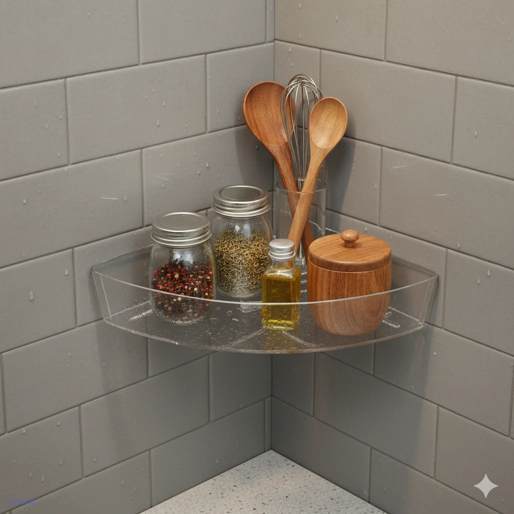 زاوية جدارية أنيقة من الأكريليك الشفاف، تثبيت بلاصق قوي (عدد 2) بدون حفر أو مسامير، مثالية لتنظيم أغراض الحمام أو المطبخ مع شكل مرتب وعملي.