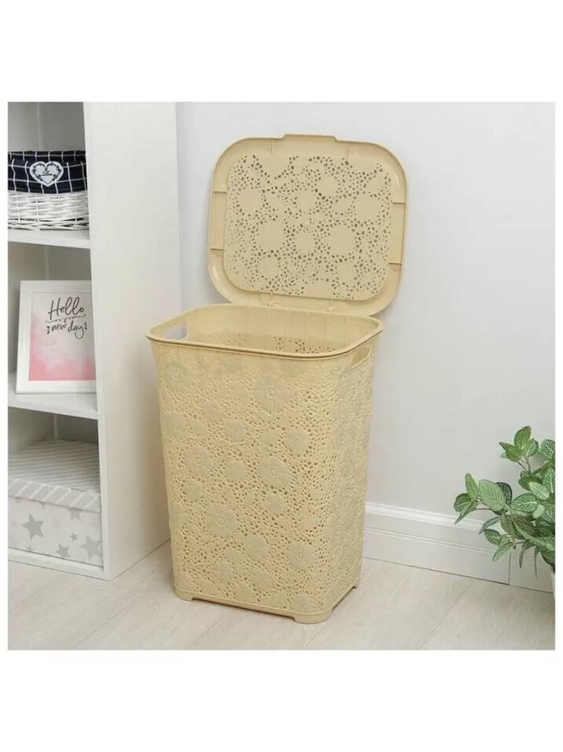 سلة غسيل بتصميم دانتيل أنيق، سعة كبيرة 50 لتر لتخزين الملابس والمناشف. مزودة بمقابض مريحة وتهوية ممتازة.