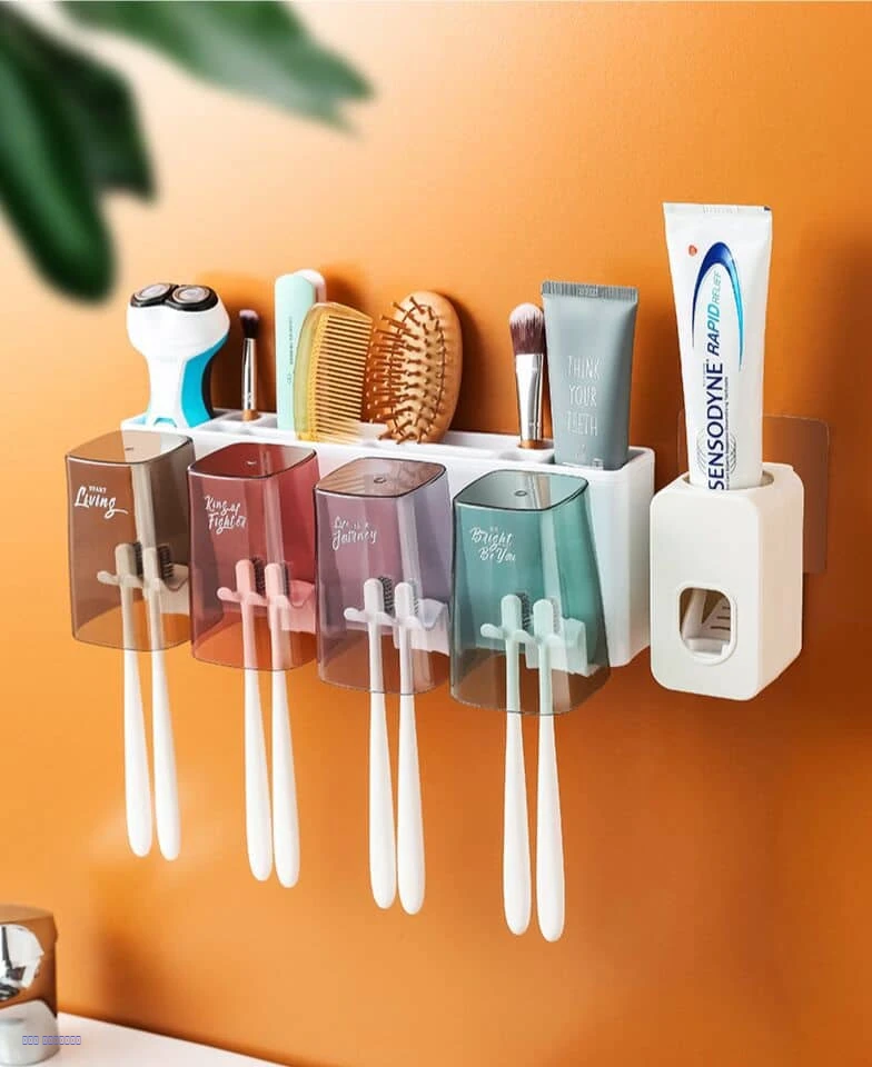 ✅ أربع أكواب معلّقة بألوان أنيقة لأفراد العائلة ✅ فتحات تهوية لمنع الرطوبة وموزّع معجون تلقائي بلمسة واحدة ✅ خزان علوي لتخزين الأمواس والأمشاط ومعجون الأسنان ✅ تثبيت جداري قوي بدون مسامير ويوفر المساحة بشكل أنيق