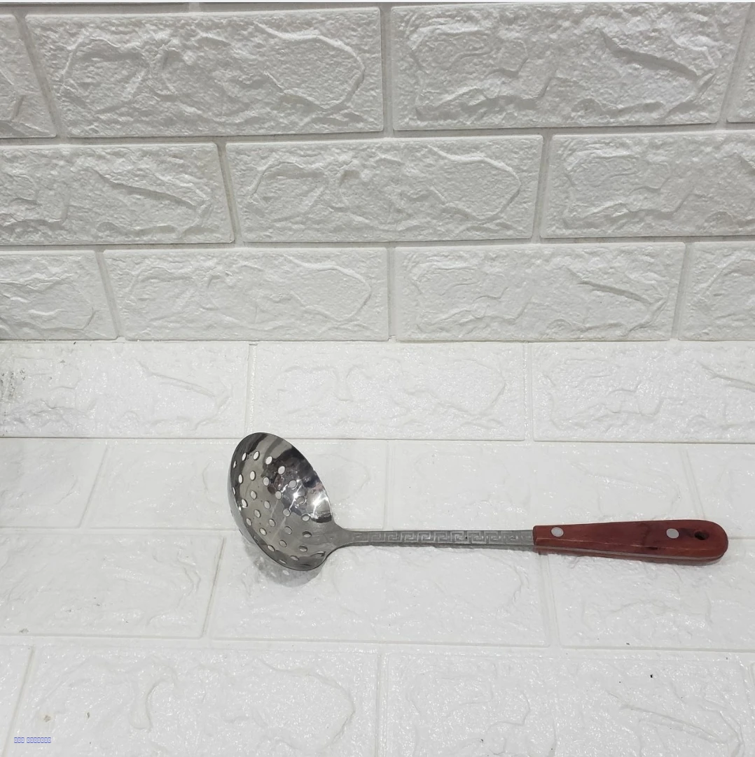 ملعقة تقديم ستيل بتصميم أنيق مع مقبض خشبي مريح، مثالية لتقديم الطعام أو الطبخ اليومي.