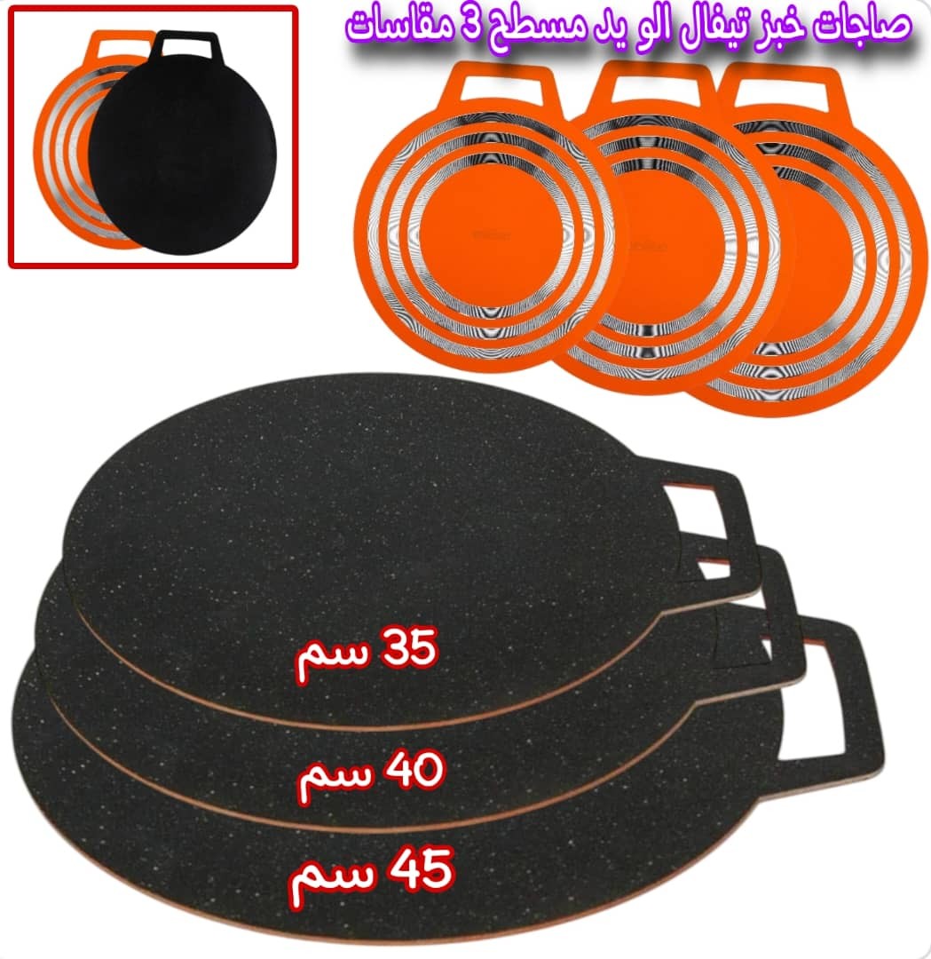 طاوات خبز مسطحة من الألمنيوم بسطح تيفال أسود ضد الخدش، آمنة وصحية 100%. قاعدة ألمنيوم موصلة للحرارة، سهلة الاستخدام والتنظيف، متوفرة بثلاث مقاسات.