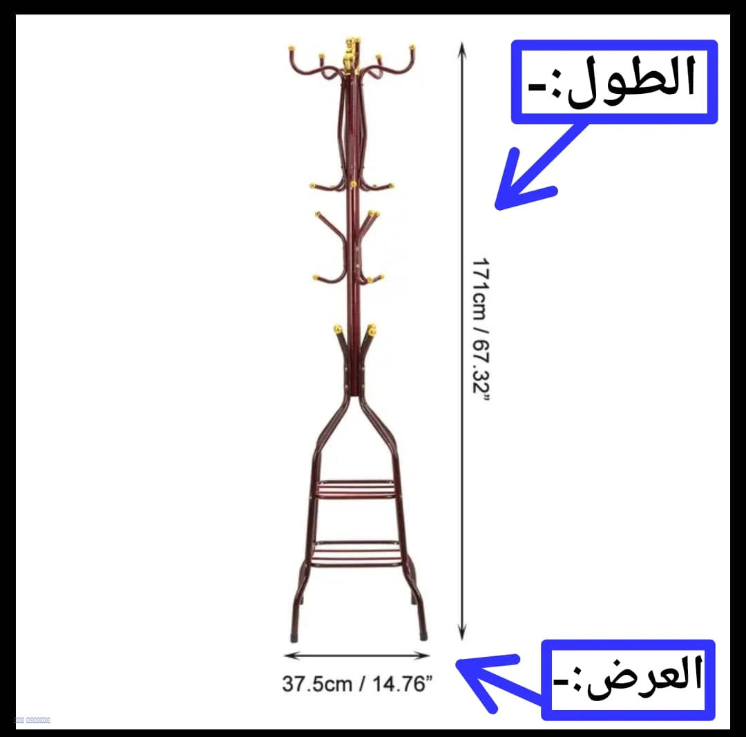 شماعة ملابس قوية مصنوعة من الفولاذ المقاوم للصدأ، تحتوي على 18 خطاف للتعليق بالإضافة إلى رفوف سفلية لترتيب الأحذية أو الصناديق. مثالية لتنظيم الغرف والمداخل.