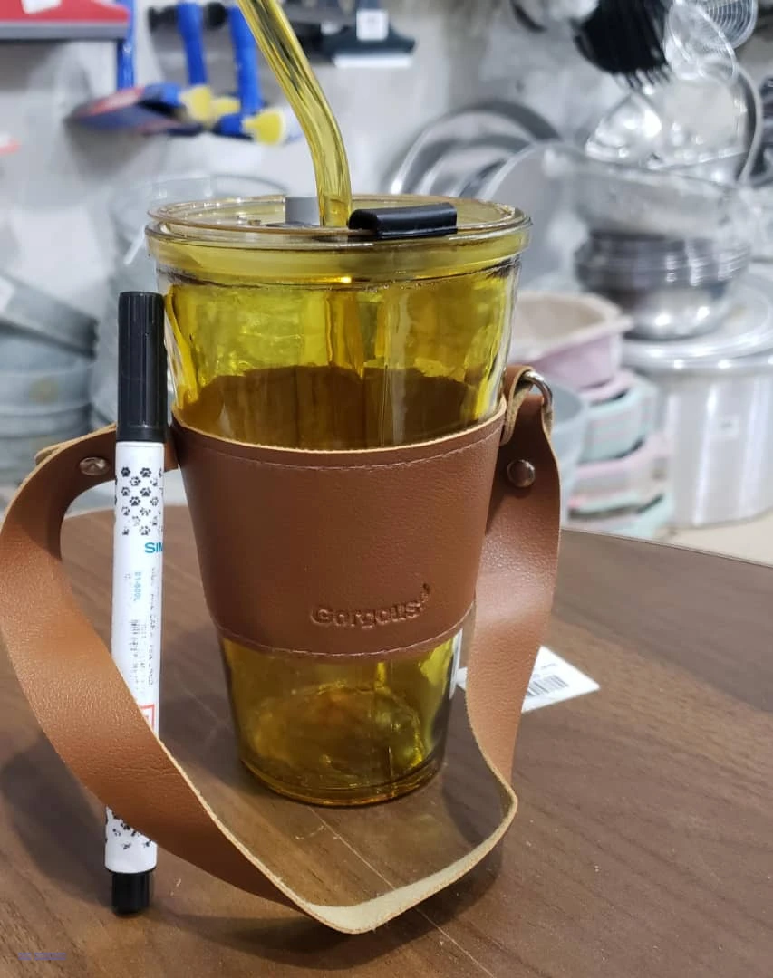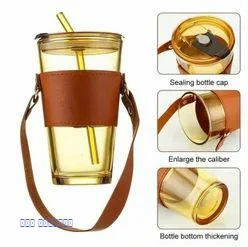 كوب زجاجي أنيق بمقبض جلدي مع حامل جلدي عملي، سهل الحمل ومناسب للمشروبات الباردة والساخنة للاستخدام اليومي.