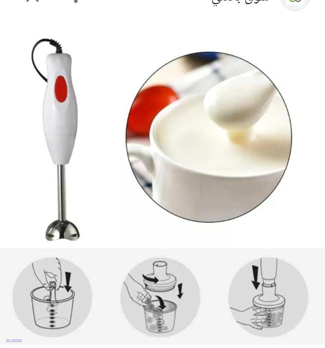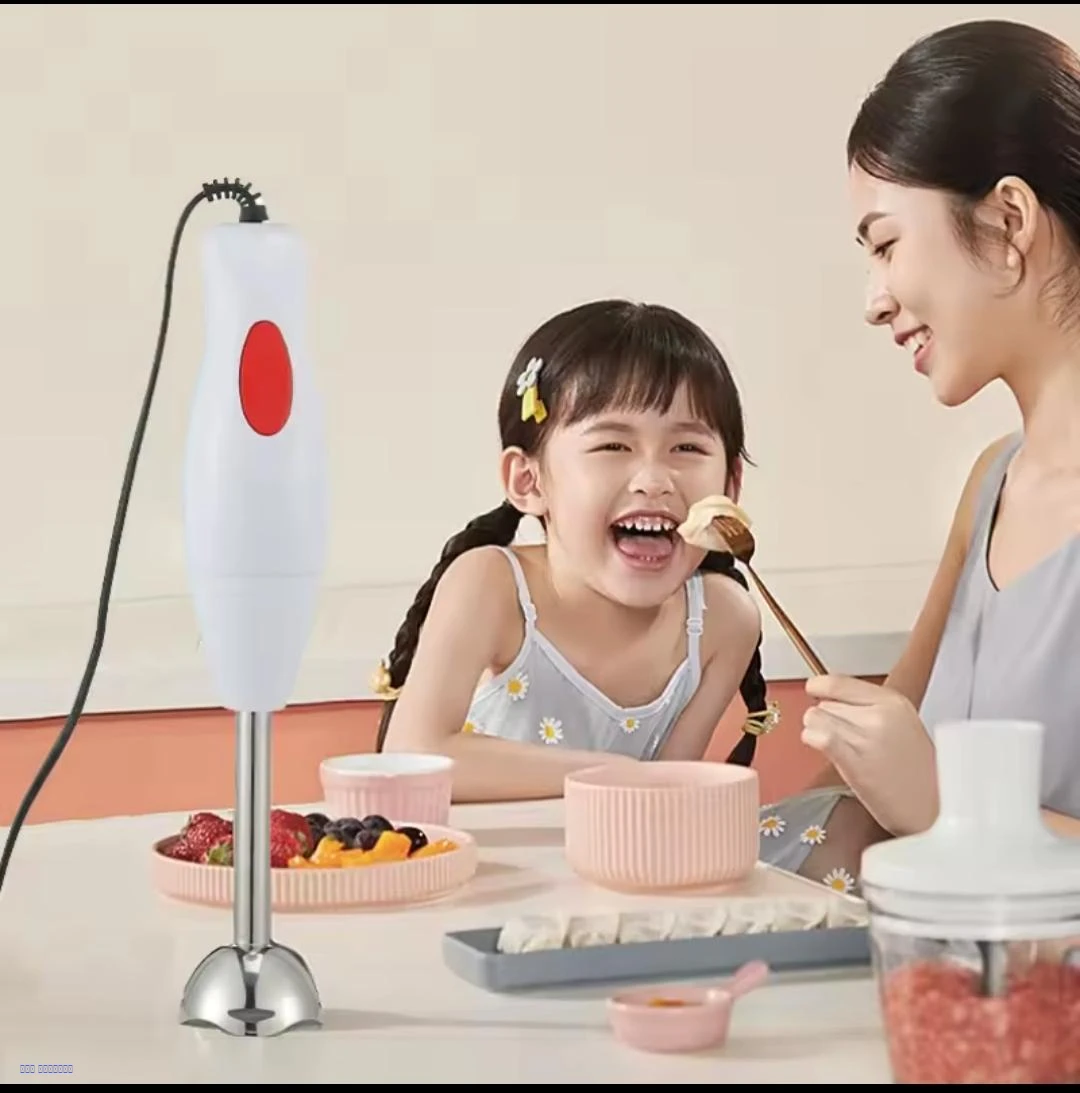 خلاط يدوي كهربائي بعصا ستيل، محرك نحاسي قوي 300 وات، شفرات من الستانلس ستيل، وعاء شفاف، تصميم مريح وسهل الاستخدام.