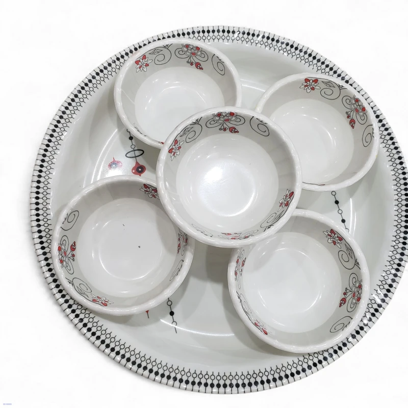 عرض مميز يحتوي على صحن تقديم أنيق مع 5 مطايب ميلامين متناسقة بالألوان والتصميم.