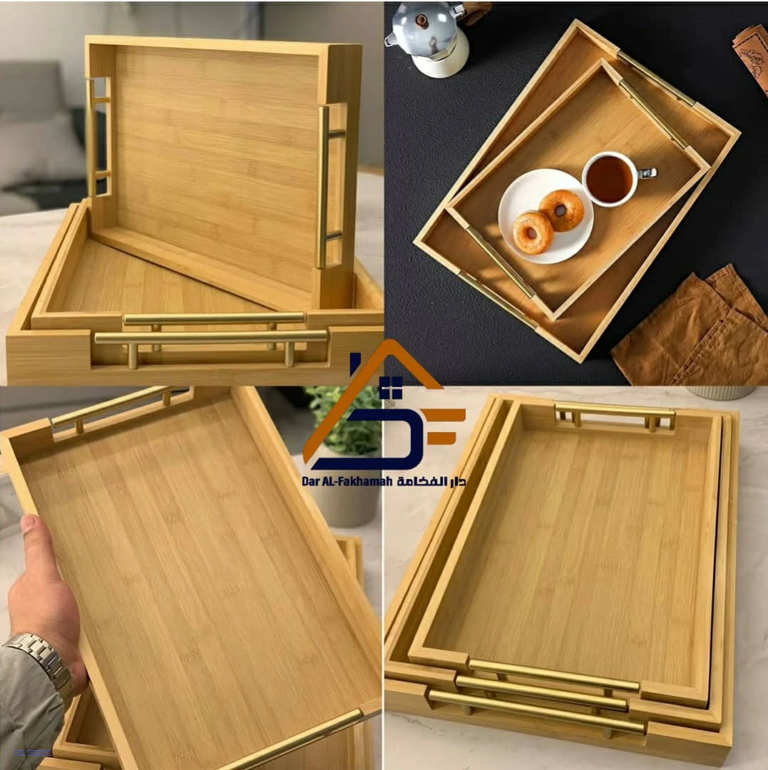 صحون تقديم من خشب جافي طبيعي مع مقبض ستيل أنيق، مناسبة للضيافة والتقديم.